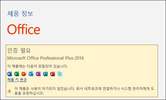 오피스 정품인증을 받지 않으면 정품인증, 제품키를 입력하라고 뜨게 됩니다. 인터넷에 돌아다니는 많은 설치 파일이나 정품 인증 프로그램은 악성코드와 랜섬웨어 등 감염 위험이 따르기 마련입니다.