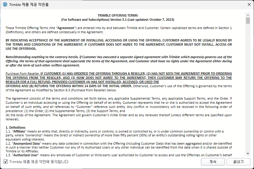 처음에는 제품 제공 약관을 동의하라고 나옵니다. 왼쪽 하단에 동의 체크를 해주시고 계속을 클릭해서 넘어가 줍니다.