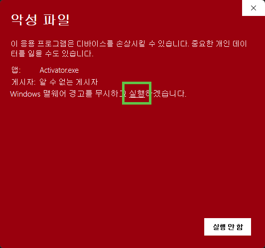 크랙 인증이기 때문에 악성 파일로 인식될 수 있습니다. [추가 정보]를 클릭하신 후 [실행]을 해주시면 문제 없이 실행할 수 있습니다.