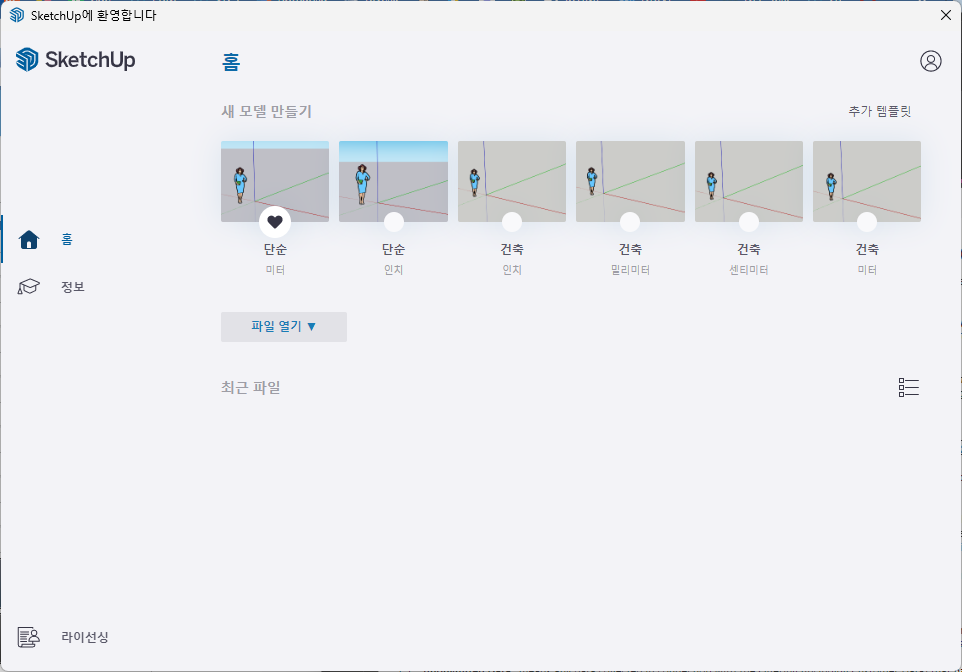 스케치업 프로그램이 정상적으로 실행되는 것을 확인하실 수 있습니다.