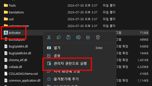 Activator 파일을 옮겨주셨다면 마우스 오른쪽 클릭을 하신 후 [관리자 권한으로 실행]을 클릭해서 열어 줍니다.