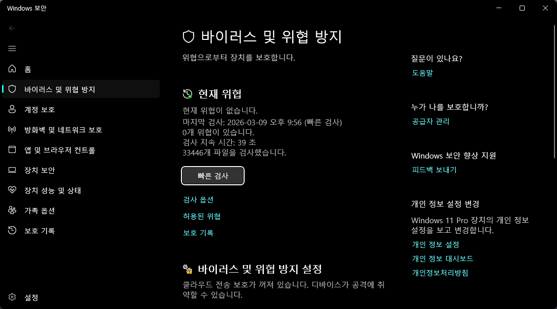 윈도우 검색에 바이러스 및 위협 방지를 검색하셔서 설정 참을 열어 줍니다.