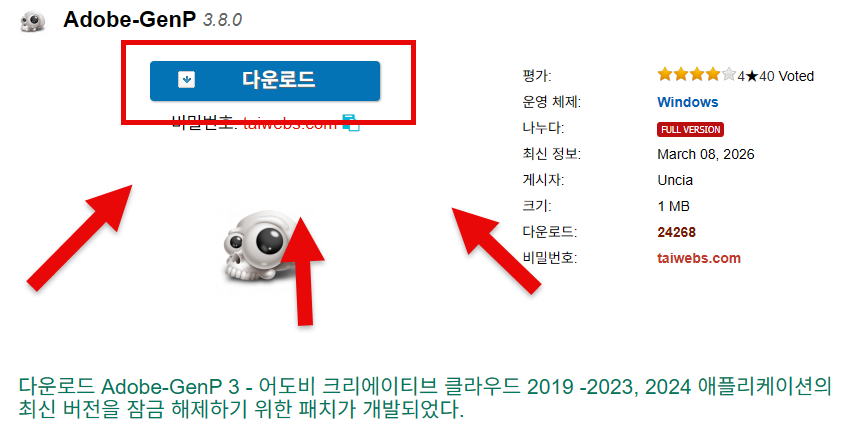 먼저 taiwebs라는 곳에서 adobe-genp를 다운로드 해주셔야 합니다. 정품인증만을 지원하는 프로그램이라 용량 자체는 정말 작습니다.