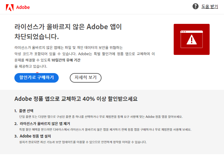 라이선스가 올바르지 않은 Adobe 앱이 차단되었습니다. 라는 메시지가 나타납니다.