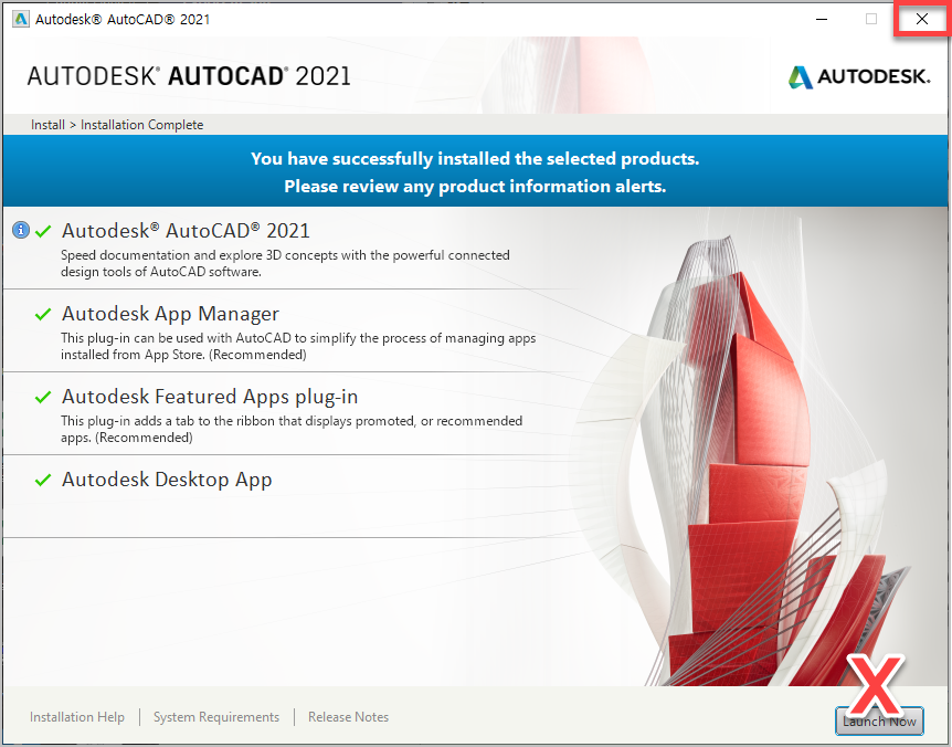 설치가 다 됐으면 절대 Launch Now를 클릭하지 마시고 X를 눌러서 창을 닫아 주셔야 합니다. 만약 그냥 무심코 실행해 버리셨다면 인증이 되지 않기 때문에 다시 삭제하시고 관련 레지스트리 값들도 다 지워야 하는 번거로움이 있습니다.