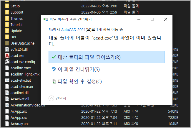 여기 똑같이 acad.exe 파일이 있습니다. 아까 Fix 폴더 안에 있던 파일을 여기에 덮어쓰기를 해주시면 크랙 정품 인증이 완료가 됩니다.