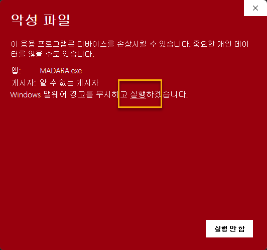 실행을 하시면 악성 파일로 인식할 수 있습니다. 추가 정보를 클릭하시고 실행을 해주셔야 정품 인증 패치 툴이 실행이 됩니다.