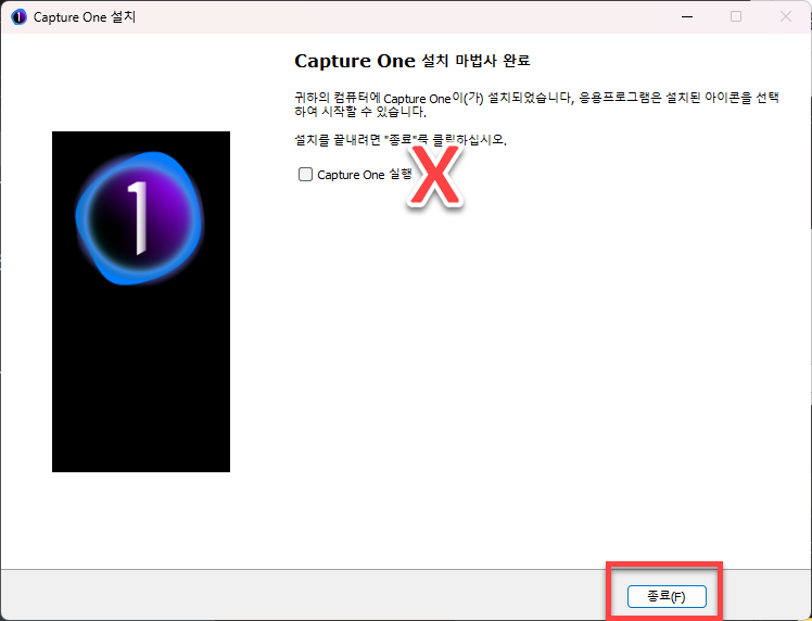 설치가 완료된 후 중요한 점은 Capture One을 실행하시면 안됩니다. 실행하시게 되면 정품 인증을 진행할 수 없습니다. 바로 종료를 해주시면 됩니다.