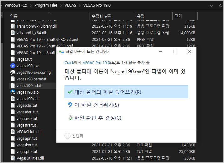Crack 폴더에 들어가 보시면 protein, vegas190.exe 두 개의 파일이 나옵니다. 이 파일을 아래의 경로에 덮어씌워 주세요